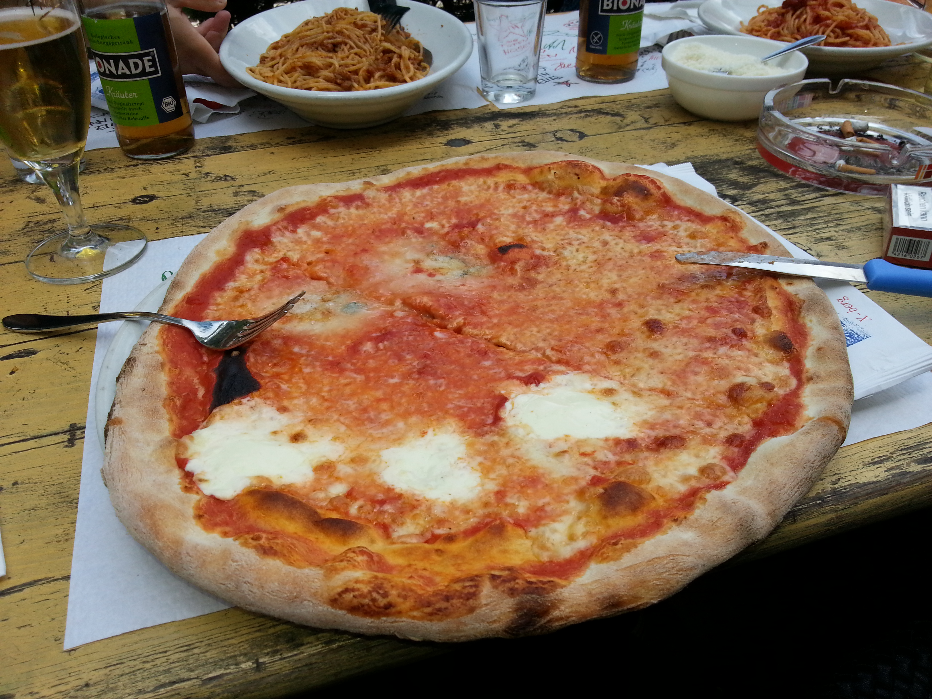 Unsere kleine Gruppe entschied sich für Pasta Ragu (oder wie der jute Deutsche sagt, Spagetti Bolognese), Pasta Pomodoro (Spagetti mit Tomatensauce), Pizza Quattro Formaggi, Pizza Quattro Statione (na, Thomas, kannst Du es jetzt aussprechen 🙂 – die andere Pizza habe ich vergessen.