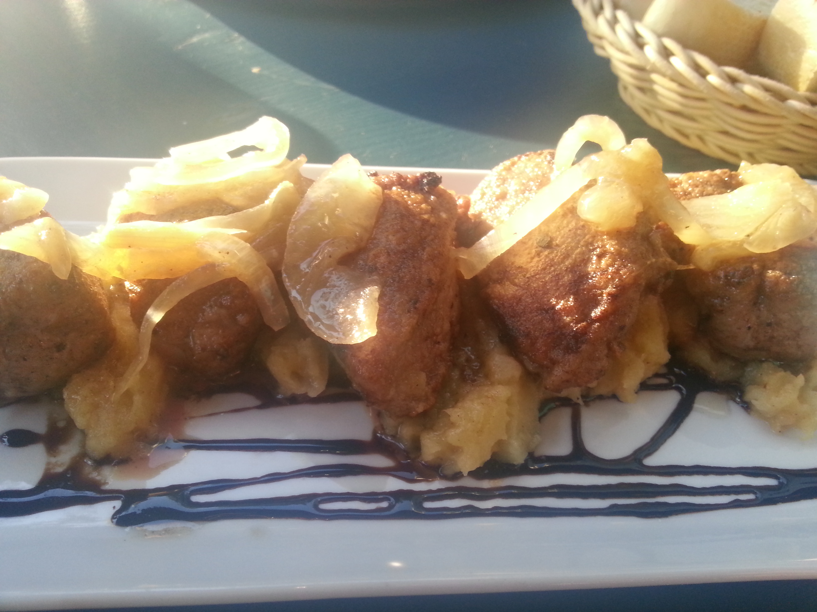 Egal…also wir haben uns die gemischten Tapas bestellt. Jamon, Salami, Patatas Bravas, Chorizo, Manchego, Kroketten, Albondigas…das übliche…ergänzt wurde auf Empfehlung um ein Millefeuille von der Kartoffel und Lachs und Leber mit Apfel- Zwiebelpüree