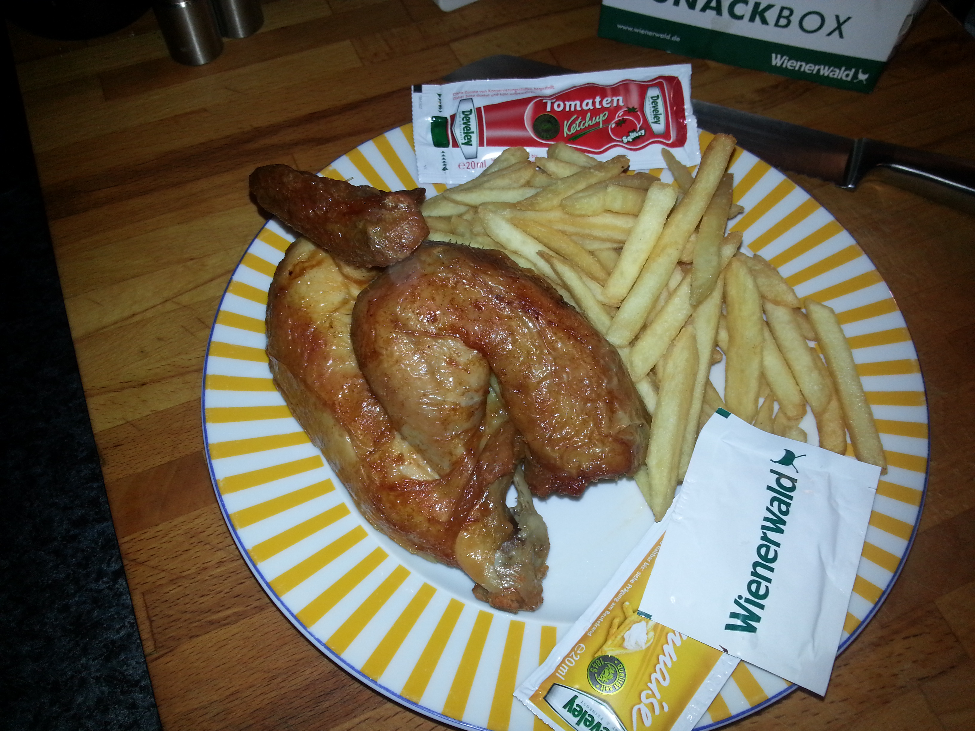 Also nahmen wir nach ca. 10 min unser Essen entgegen und fuhren nach Hause. Ich hatte ja die heimliche Hoffnung, dass die Hähnchen nochmals knusprig aufgegrillt werden und zauberhafte Broiler werden. Aber leider Fehlanzeige. Optisch also kein Highlight. Blass, nicht knusprig – dafür wurde das Hähnchen Halal geschlachtet. So, so.