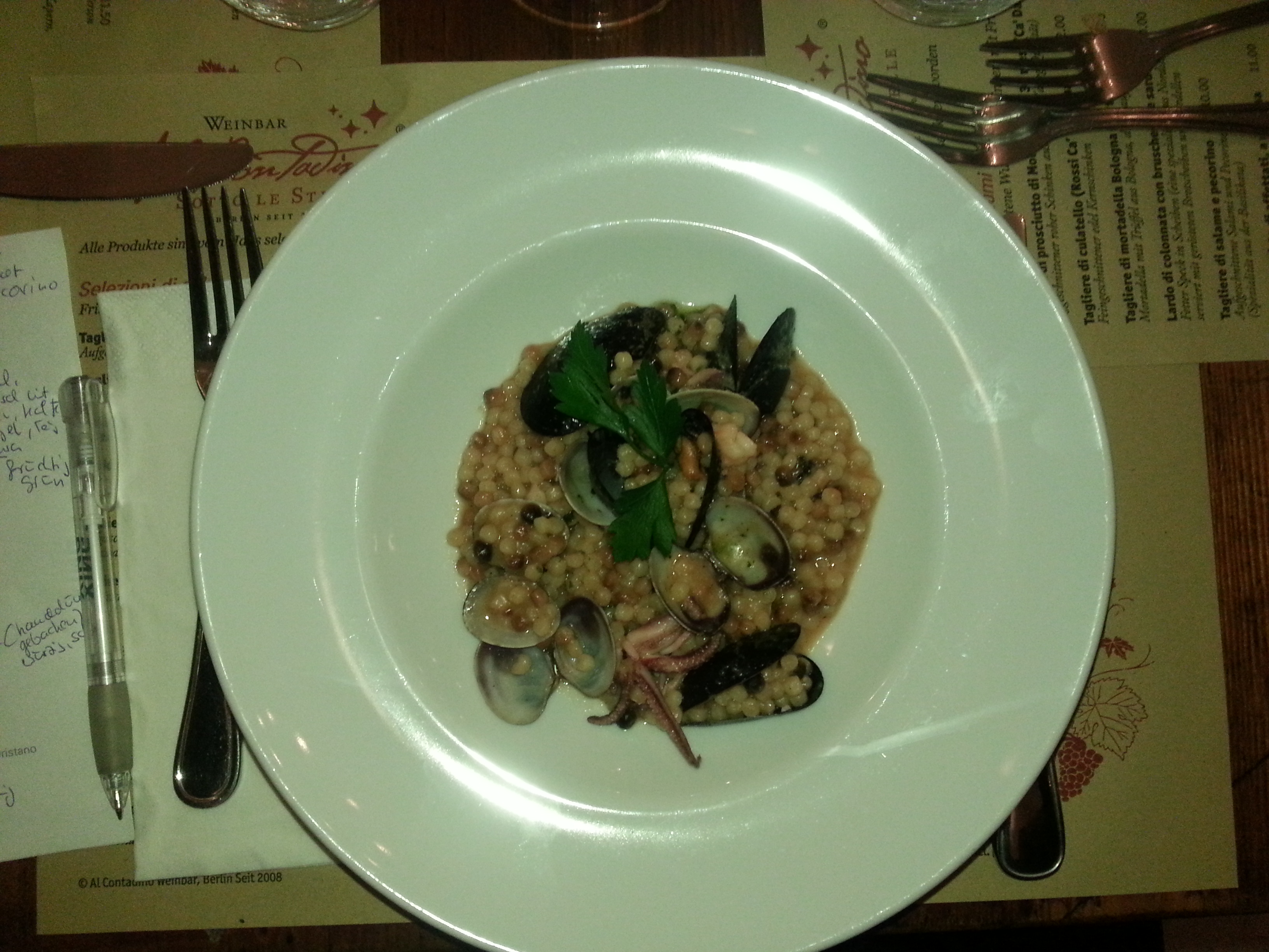 Als erster Gang! (Gott wir waren schon satt) gab es Sardische Fregola verrührt mit den Köstlichkeiten des Meeres. Fregola ist eine Art Nudel- bisschen wie Ebly (man sagt es ähnelt israelischen Cous Cous, was ich aber nicht bestätigen würde) aber ganz rund. Dazu due cozze (Venus- und Miesmuscheln) und es war ein Gedicht. Werde ich nachkochen – unbedingt…!!!
