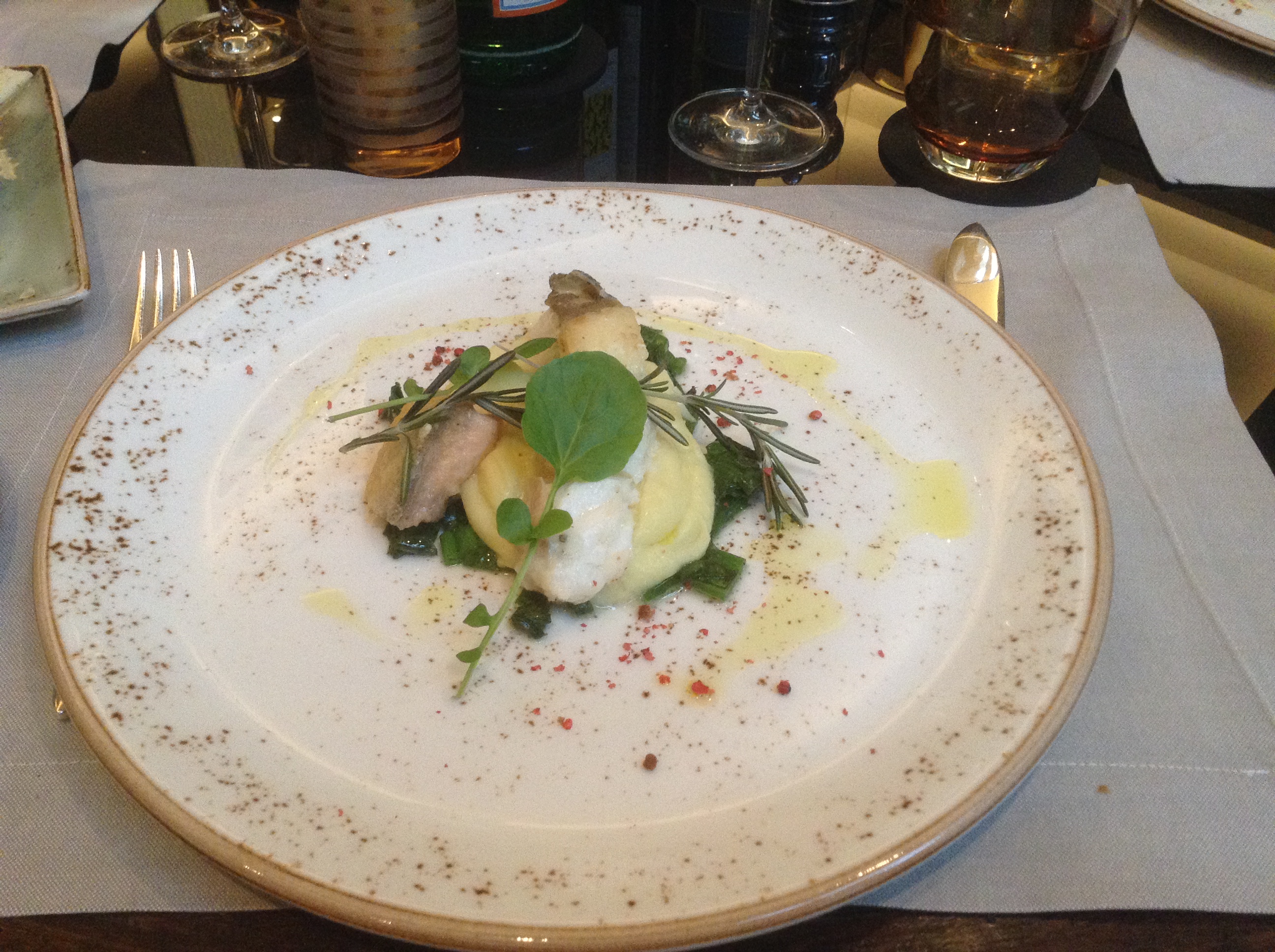 Dreierlei vom Edelfisch mit Kartoffelpüree. Der Fisch wirklich optimal zubereitet. Das Fleisch leicht blättrig, besser geht nicht. Aber auch das Püree sehr gelungen.