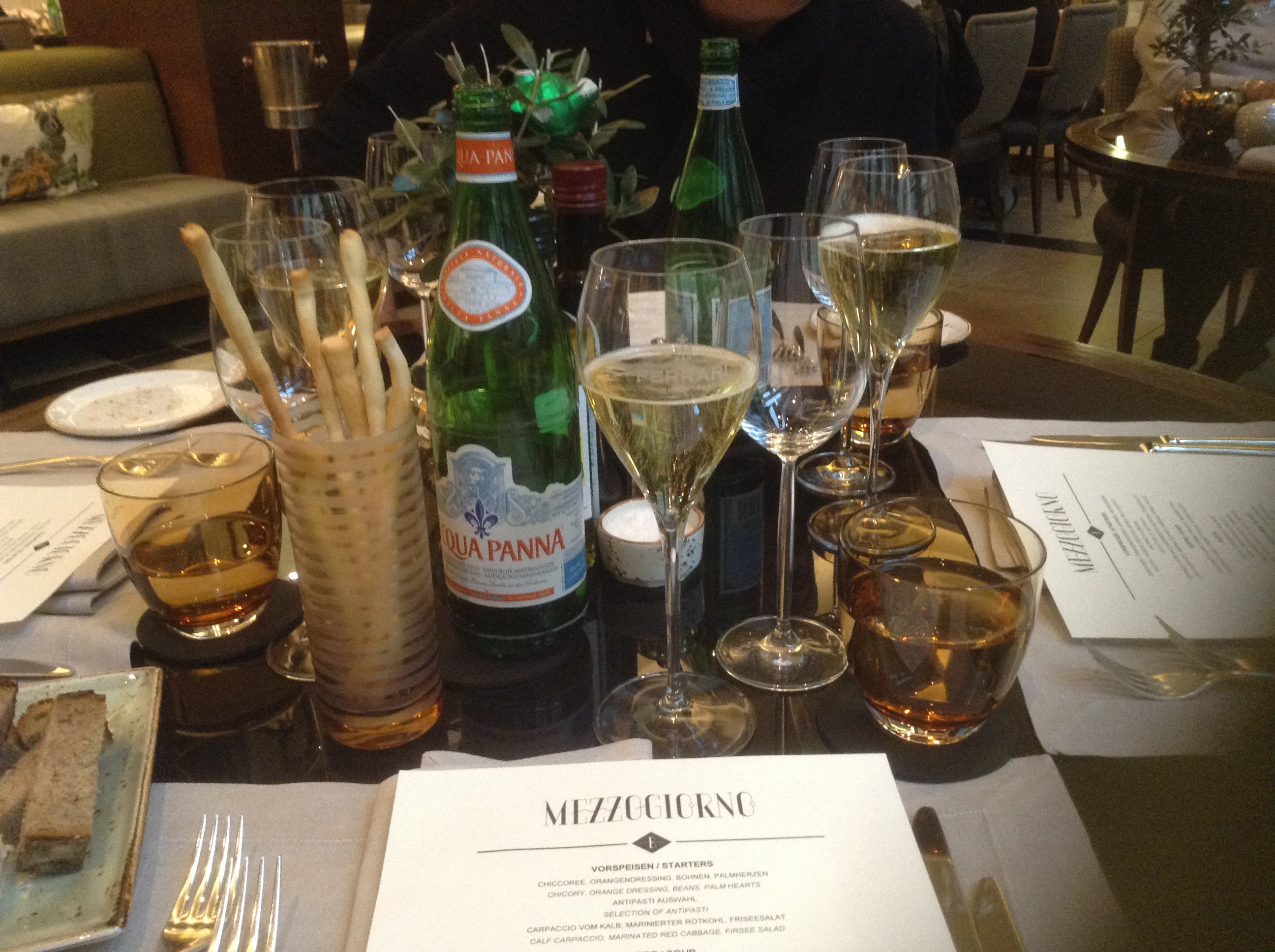 Kalbscarpaccio mit Olivenöl und Parmesan. Wirklich eine extrem gute Qualität des Fleisches, der Parmesan hat das Fleisch nicht dominiert. Für mich hat noch ein Hauch von Säure gefehlt. Das ist aber immer Geschmackssache.