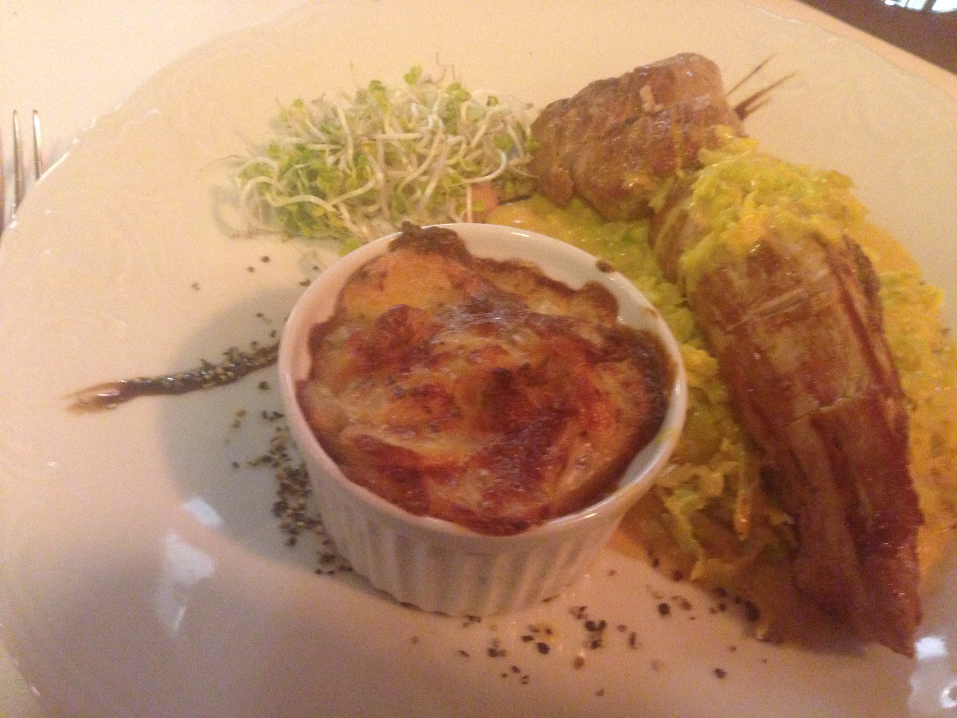 Es gibt ein Standardkarte und die besondere Empfehlung des Hauses. Ich habe mich für ein gebratenes Schweinefilet, tranchiert, auf zarten Wirsing – Curry serviert mit Kartoffel – Kräutergratin entschieden. Das Ganze für angemessene 16,90 €.
