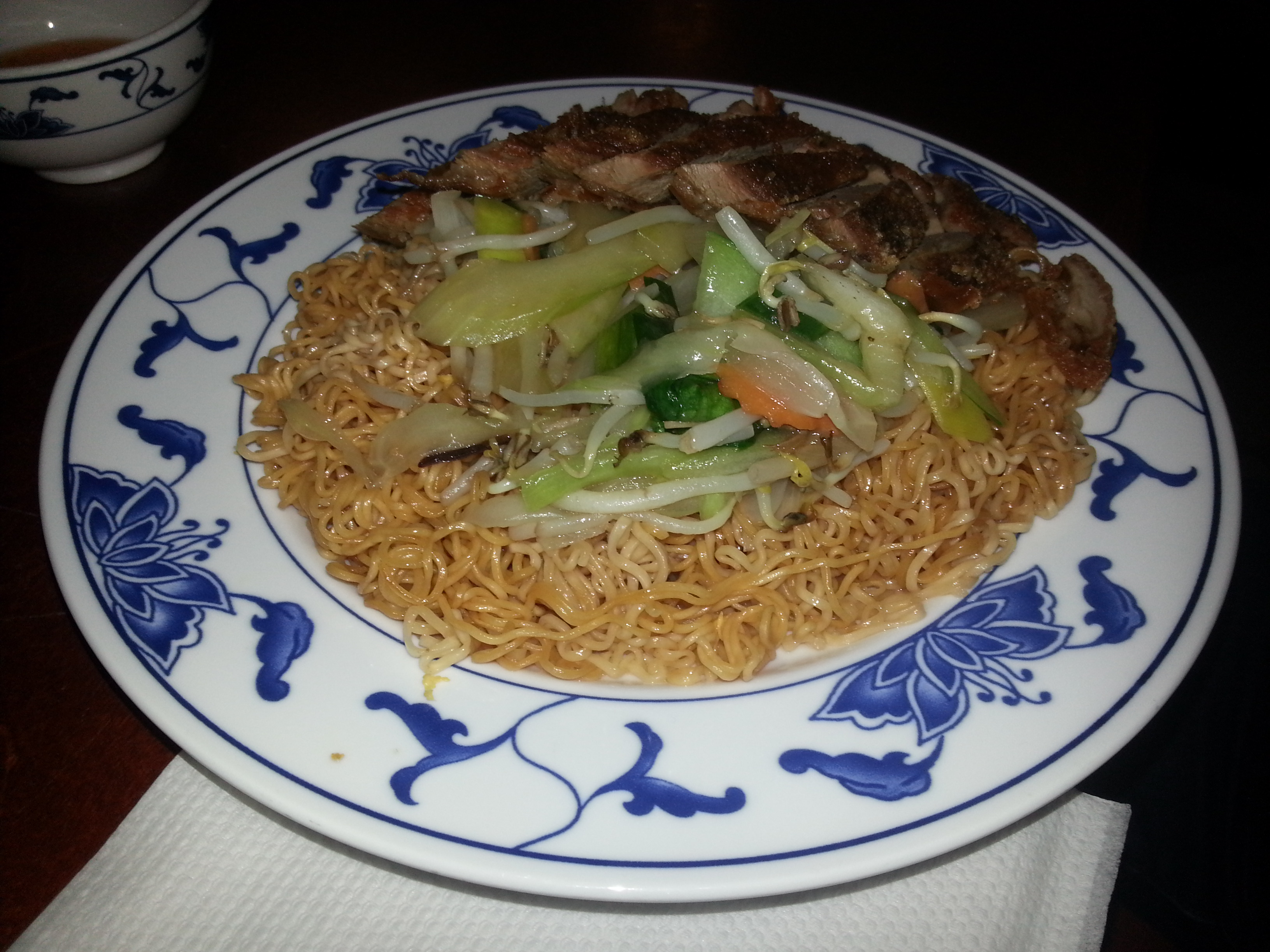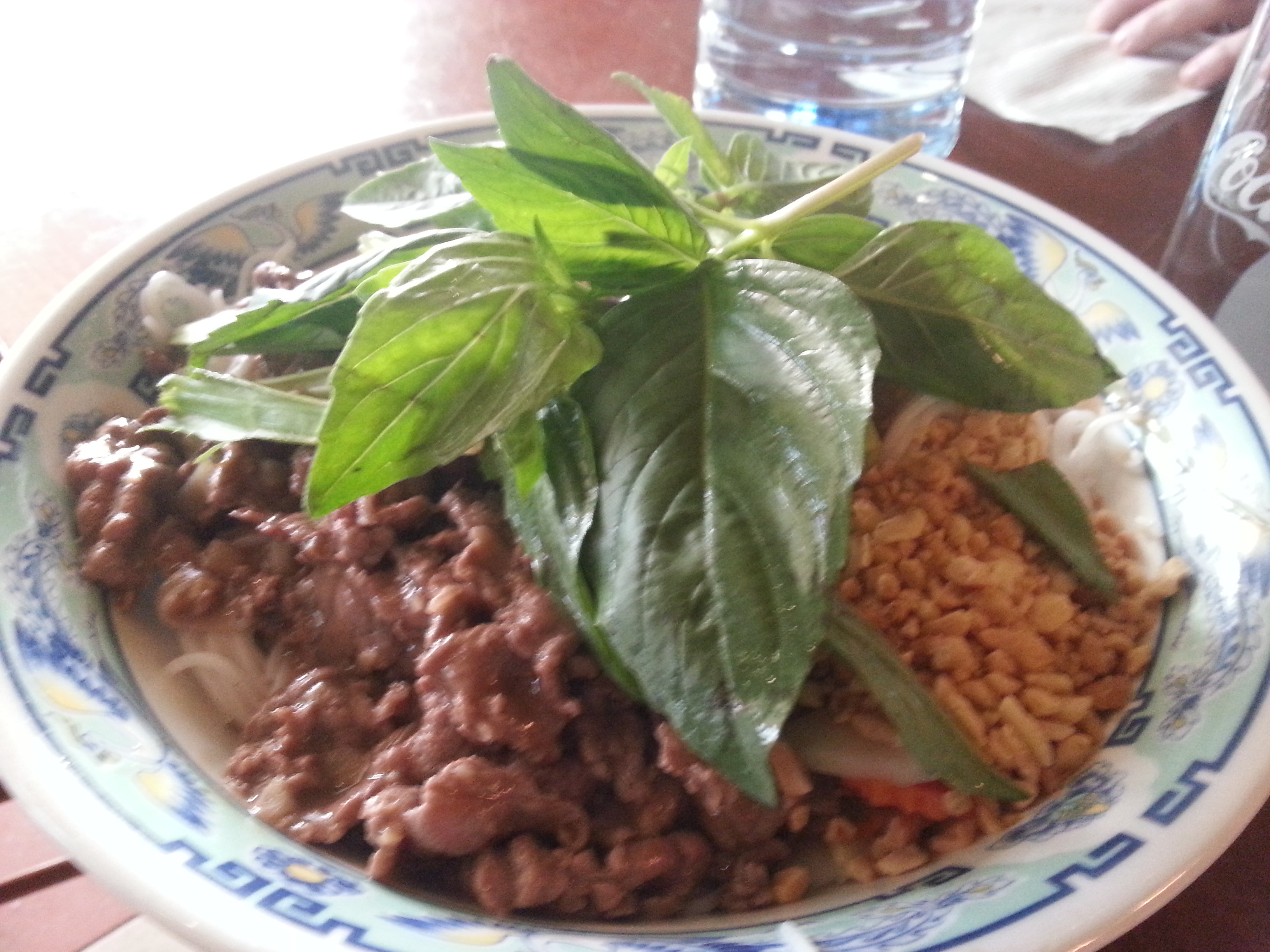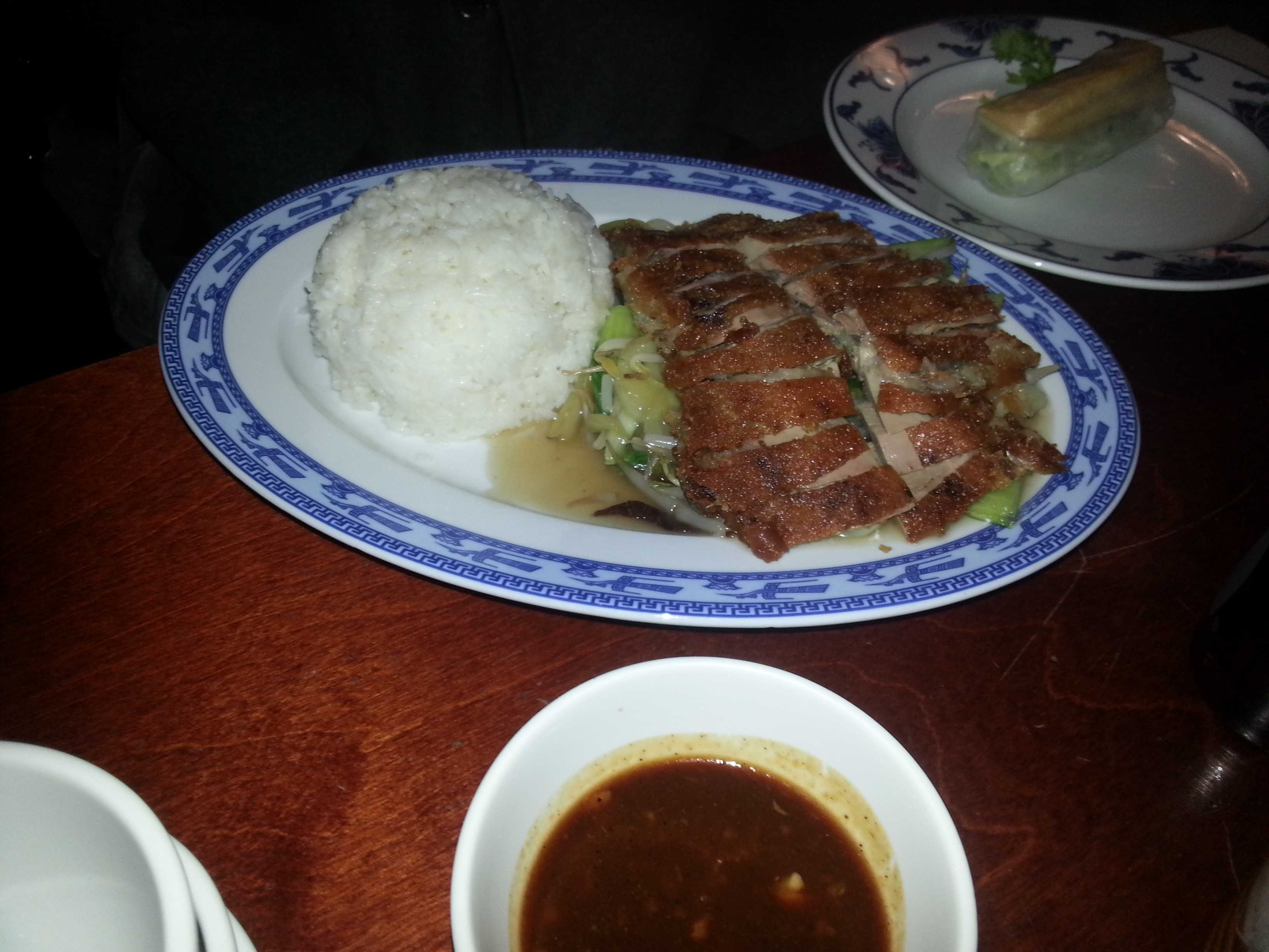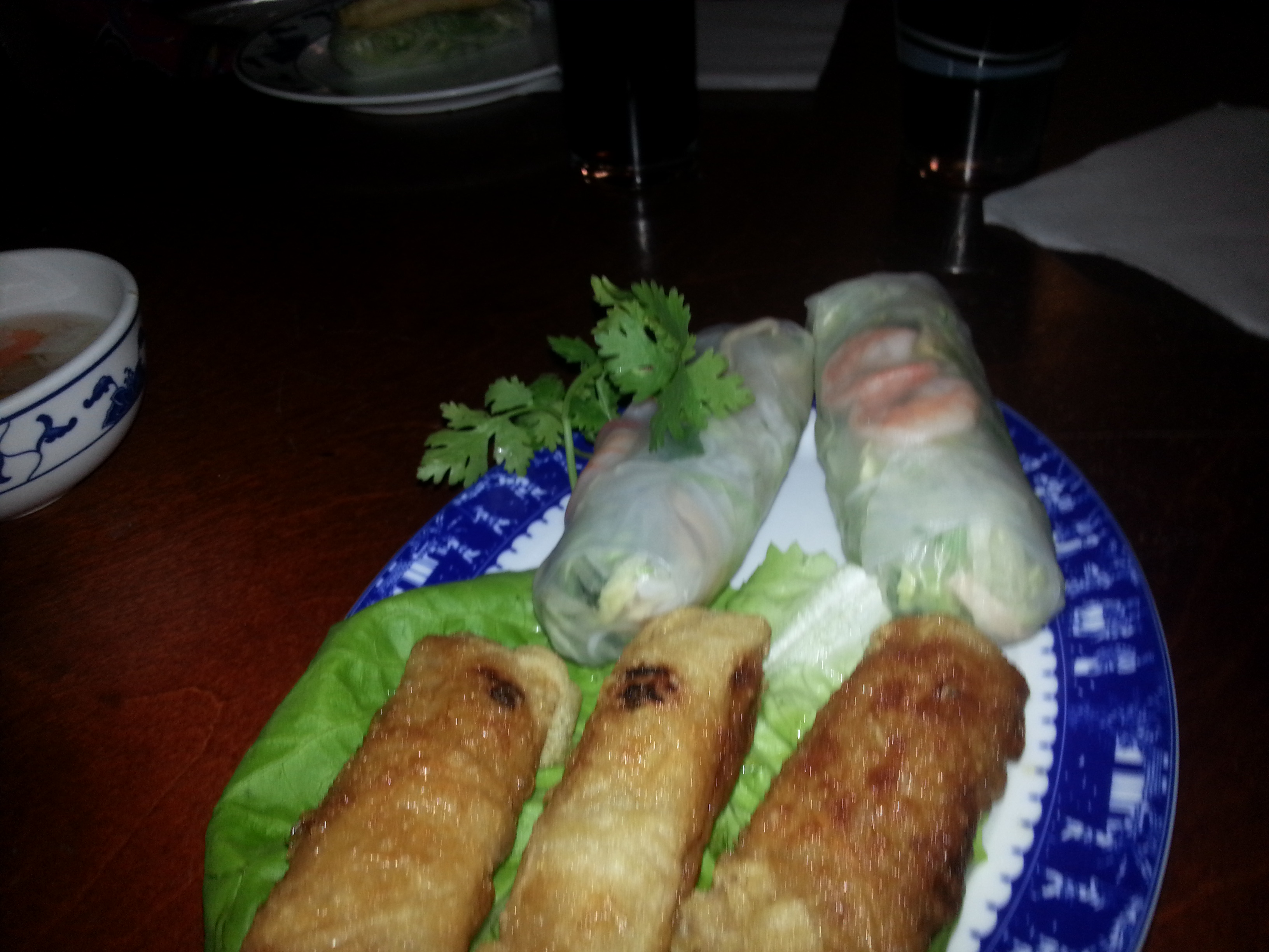 Ich hatte die Frühlingsrollen, auf die ich schon seit ein paar Tagen Appetit hatte. Wie man leider auf dem Foto nicht so gut sieht, waren die Rollen aus meiner Sicht selbstgemacht. Haben gut geschmeckt. Keine große Überraschung, aber ich war zufrieden. Die Summerrolls waren mit Salat, Kräutern, Omelett und Krabben gefüllt. Auch keine große Überraschung, aber ebenfalls vollkommen in Ordnung. Mit diversen Dips konnte man diese noch ein bisschen geschmacklich aufpimpen. Passt so – und ehrlich zu diesem Preis – sehr gut. Die Ente mit den Weizenbratnudeln prima. Wie zu erwarten, war die Ente knusprig und zart. Die Nudeln würzig. Die Portion mehr als groß. Das Gericht von J. mit den Reisnudeln sah phantastisch aus und war mit vietnamesischen Basilikum dekoriert. J. war ebenfalls sehr zufrieden und hat seine Portion geschafft (staun, staun).