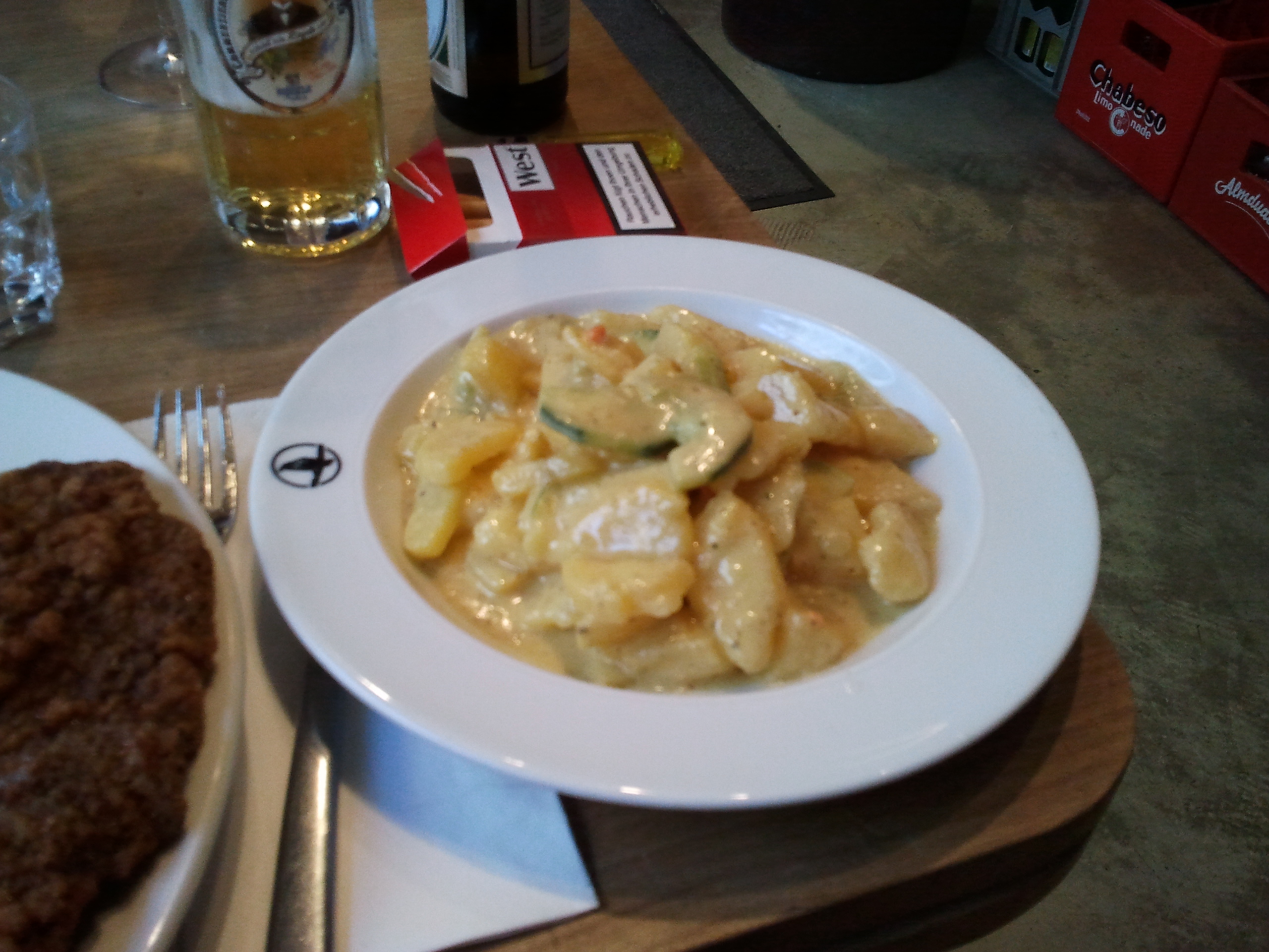 Dann kamen unsere Hauptspeisen. Mein Schnitzel, groß, braun und einer riesigen Portion Kartoffelsalat.