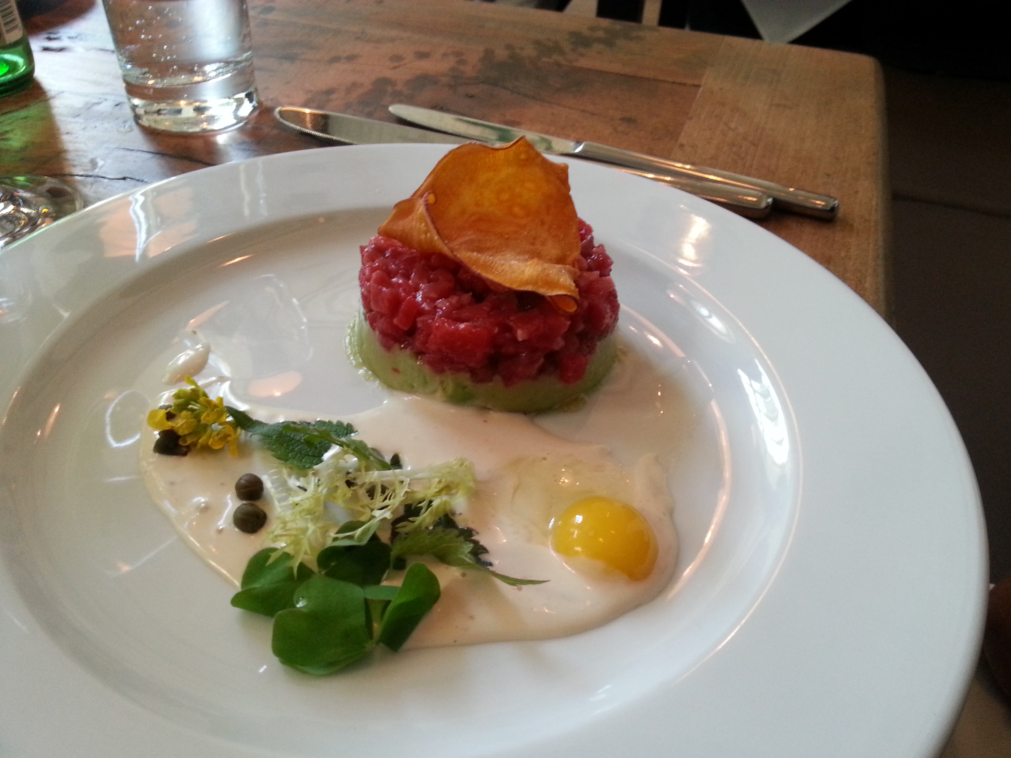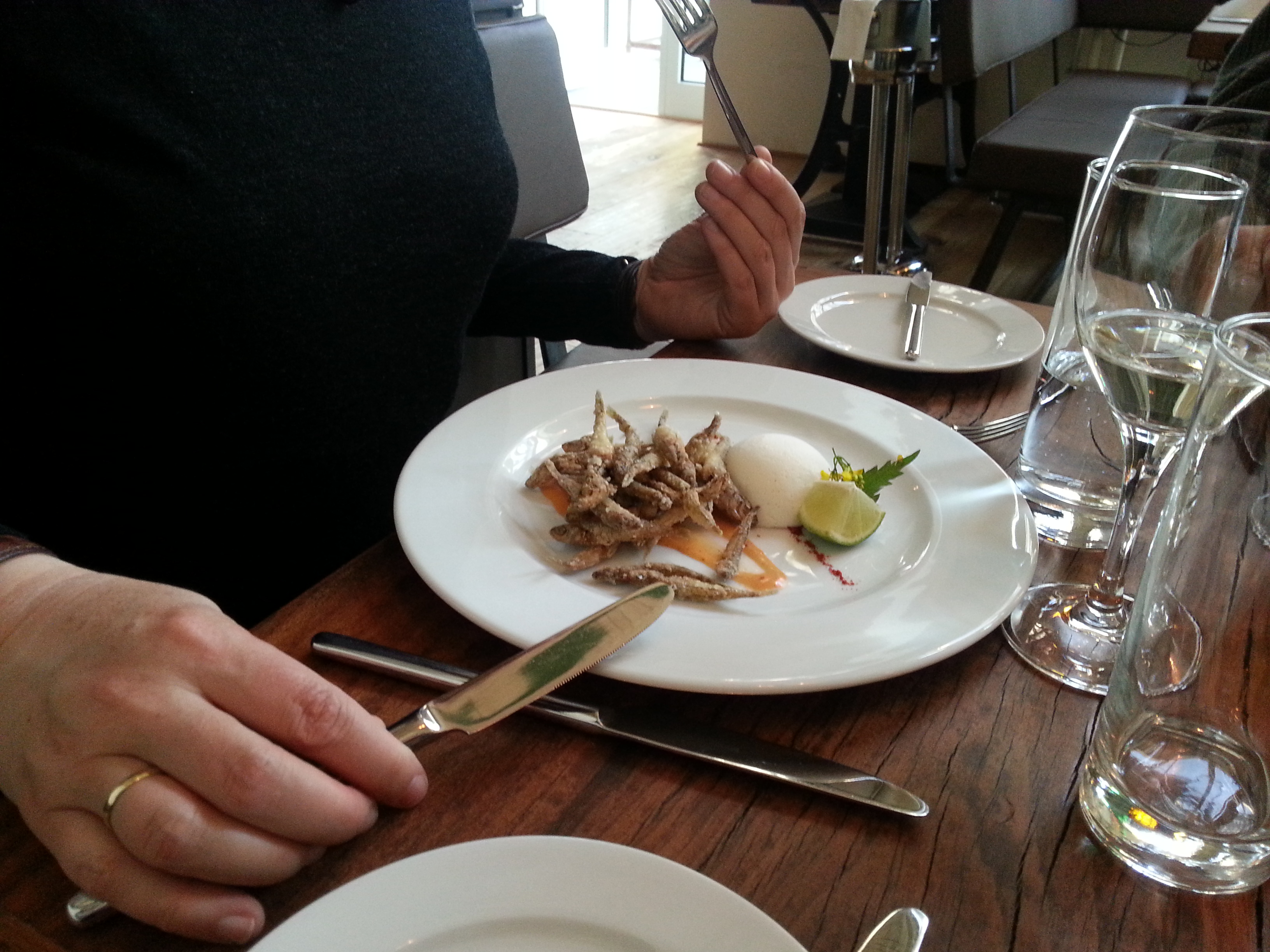 Zu den Vorspeisen: Der Rindertatar war von Hand geschnitten und nicht gewolft (sprich durch den Fleischwolf gedrückt) und wurde hübsch auf einer Art Guacomole angerichtet. Dazu gab es ein ganz kurz gebratenes Wachtelspiegelei, Kapern und wie TB sagt, eine bestimmte Sauce. Optisch ganz toll, geschmacklich sehr gut, Portionsgröße prima. Mir hat’s auch geschmeckt. Claudias Sardinen war ganz kleine Schlingelchen und schön knusprig gebraten. Nett, dass ich auch da probieren durfte. Sehr lecker. Auch Torsten war mit seinem Salat happy. Guter Start.