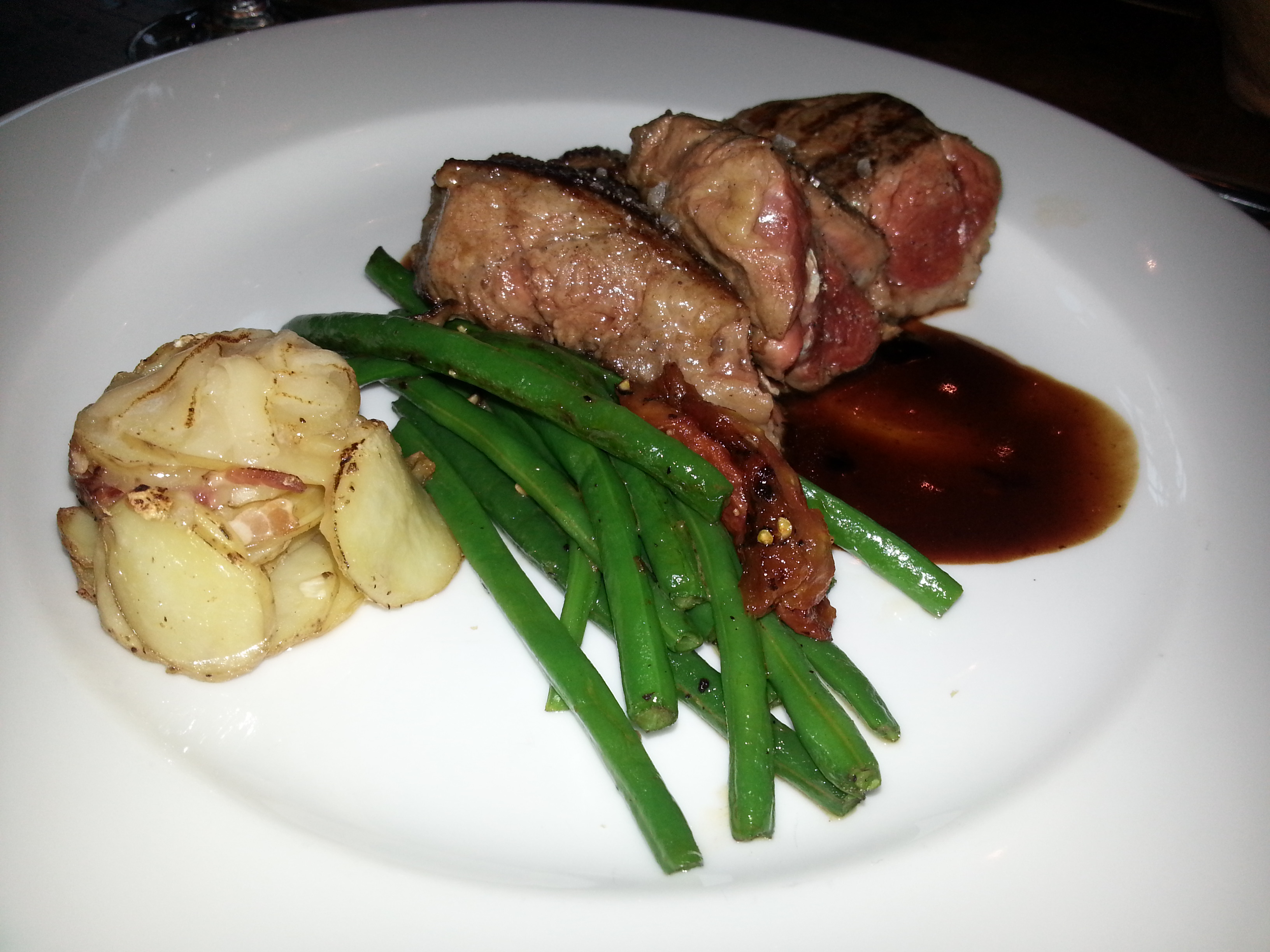 Das Entrecotes (die Jungs bestellten, englisch, medium und well done) hatten alle den richtigen Garpunkt. Leider hier auch ein Hauch zuviel Salz. Böhnchen wie Böhnchen sind, dazu ein Mini Kartoffelgratin aus der Süßkartoffel. Gesamt, ebenfalls sehr lecker. Das Fleisch war wie es halt beim Entrocte üblich ist, ein wenig durchwachsen.