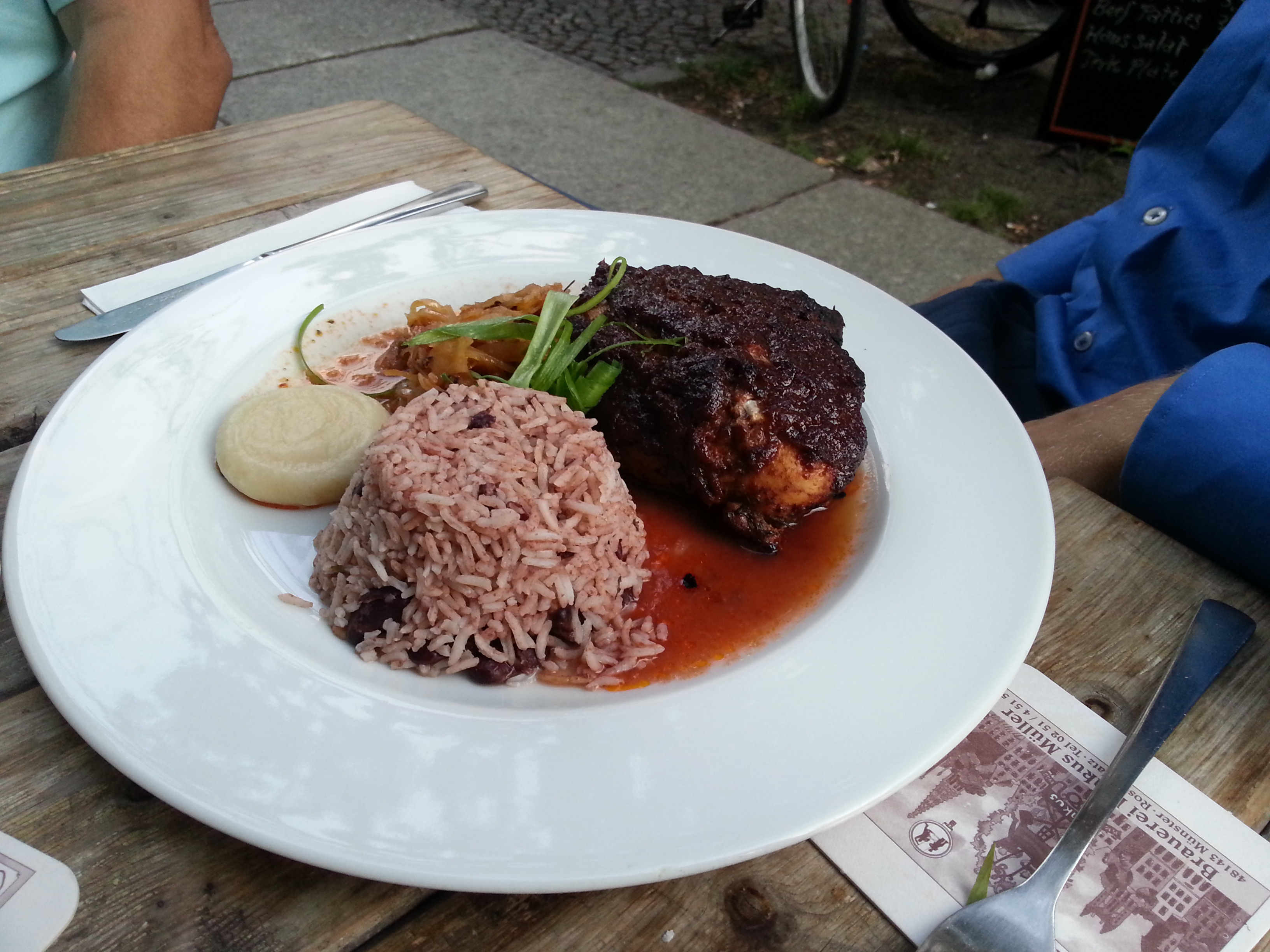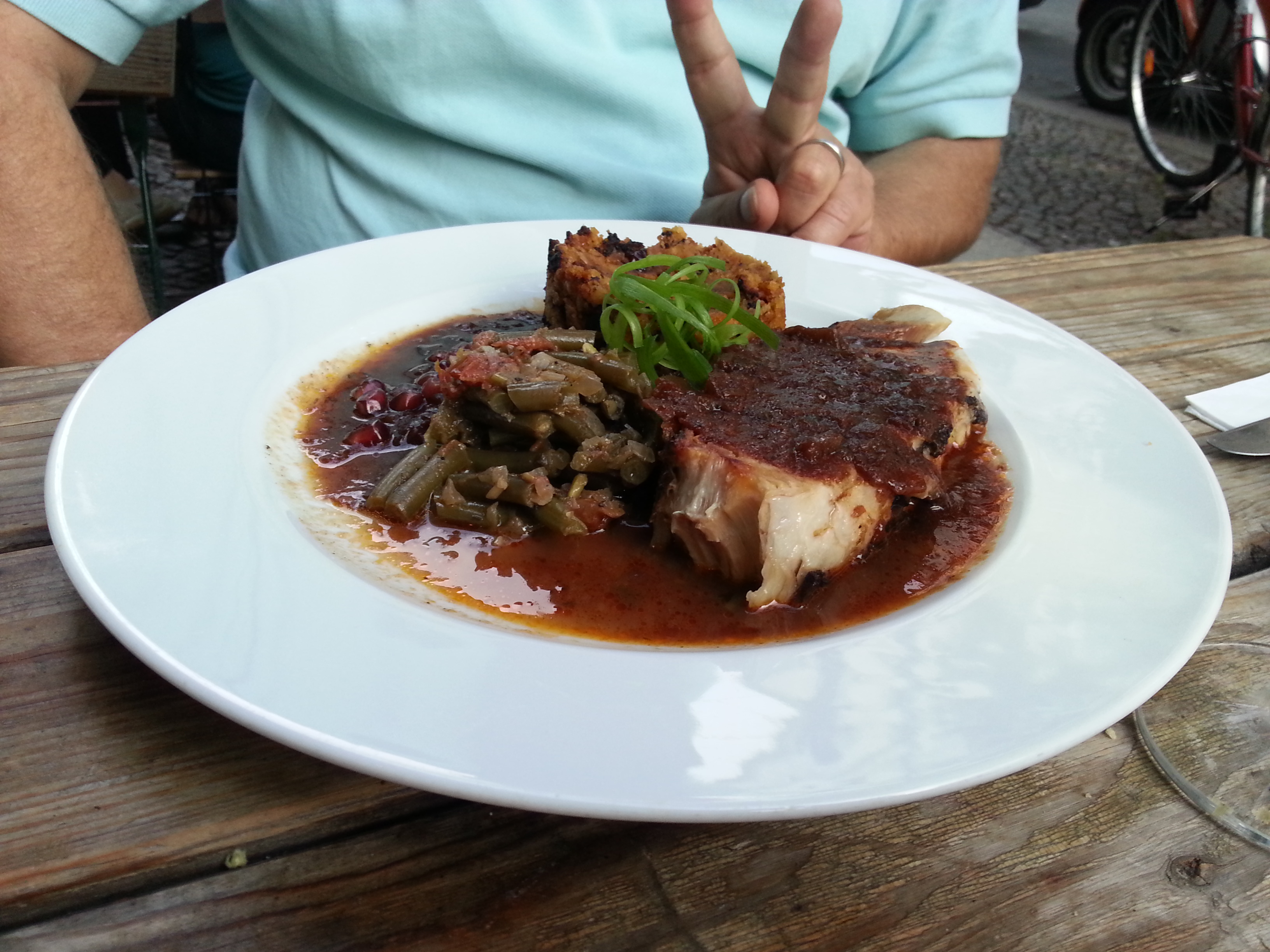 Mon ami und ich teilten uns die Pate 8€, unsere Freude versuchten es mit dem Wildkräutersalat (aber ohne Ziege, 13€), Muscheln 14€. Die Pate war sehr lecker, cremig, fluffig, mit hauchdünnen Apfelscheibchen, Silberzwiebeln und einer Art Marmelade. Dazu wurde ein sehr gutes dunkles Brot. Sehr gut. Die Muscheln wurden mit Kartoffeln, Zitronengras und weiterem Gemüse gereicht. Lt. C – überflüssig. Ihm wäre an der Stelle der Klassiker mit Weißwein lieber gewesen, da das Zitronengras den feinen Muschelgeschmack überdeckte. Der Kräutersalat sah gut aus und wurde mit Erdnüssen und Granatapfel mit Freude verspeist. Ich meine, sie hat ein bisschen mehr Salat bekommen – da die Ziege wegfiel. Am Preis hat das nichts geändert.