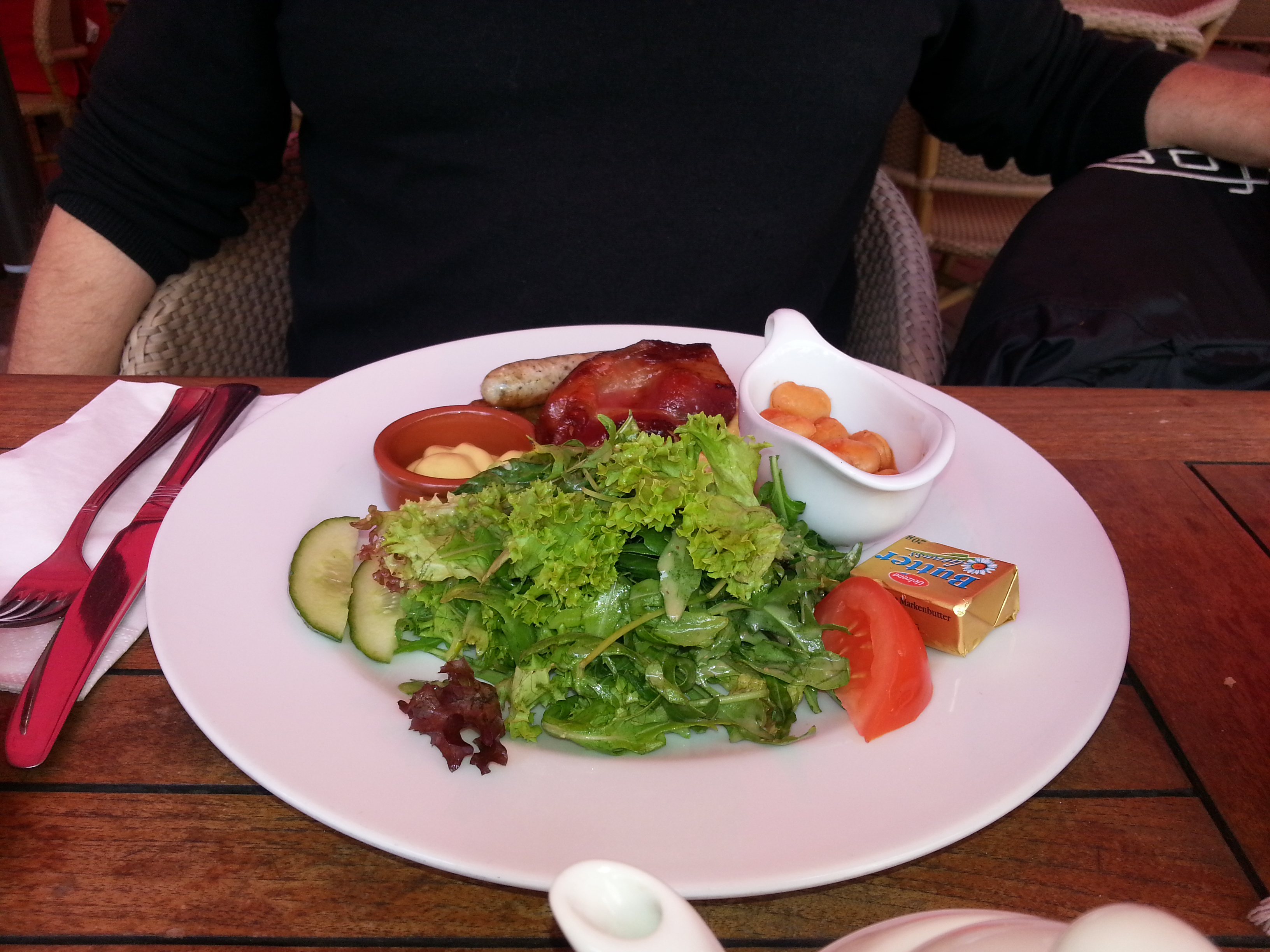 Zum englischen Frühstück wurden 3 Würstchen, dicke, weiße Bohnen in Tomatensauce, Salat und drei Rühreier und Senf gereicht. Sah erst einmal ansprechend aus. Die Würstchen waren ganz lecker, Rühreier halt wie sie so sind, die Bohnen ziemlich laff. Speck knusprig.
