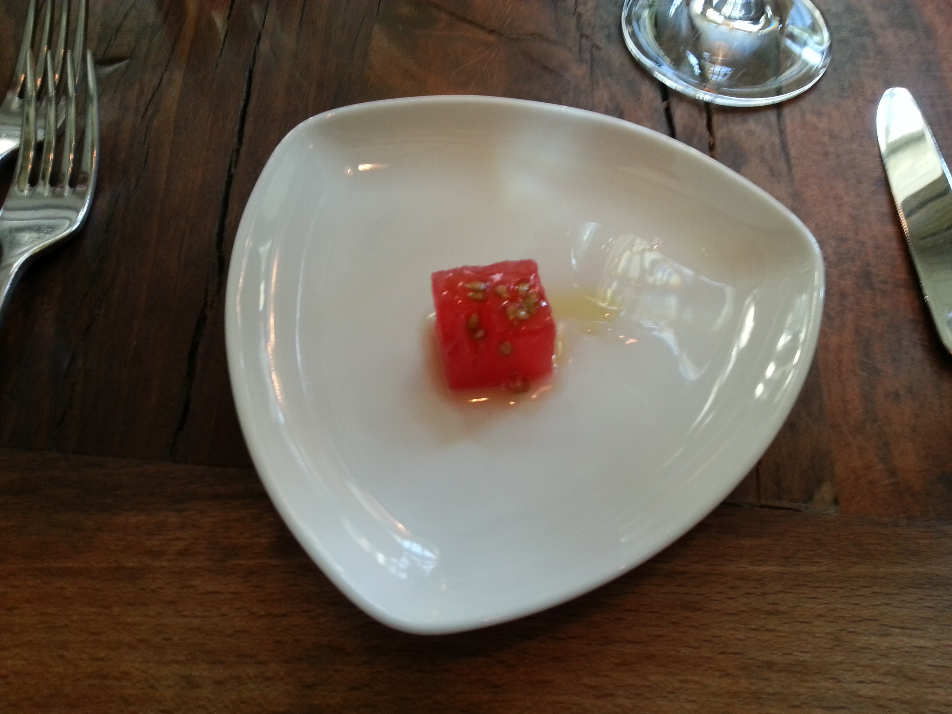 Als Gruß aus der Küche wurde ein Wassermelonenwürfel, der ein ganzes Weilchen in Sake und Wodka lag, mit Sesamöl gereicht. Hätte ich gerne püriert und im Glas gehabt. Hatte ne ziemliche Umdrehung. Aber der kleine Gruß versprach optisch und kulinarisch einiges. Spannung! Dazu gabe es sehr leckeres Brot und eine Art Dip mit Fenchel. Sehr gut.