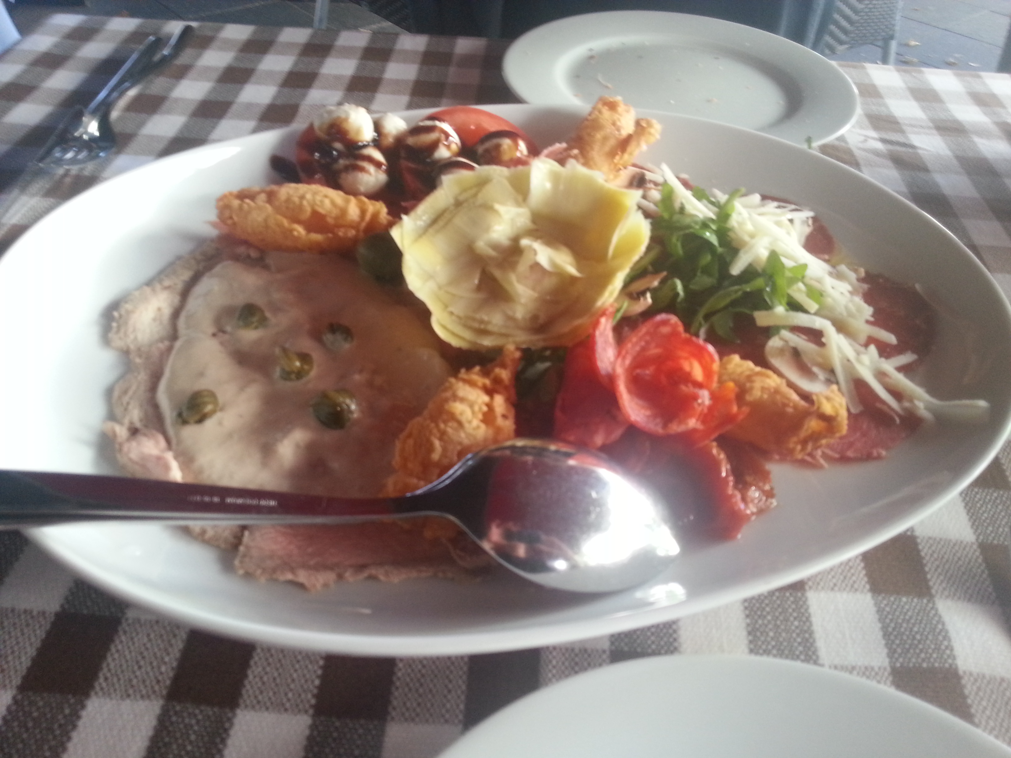 Danach kam die Vorspeisenplatte Belluccis. Optisch schon einmal sehr schön. Vertreten waren die Klassiker Vitello Tonnato (eines meiner Lieblingsgerichte), Carpaccio, Tomate Mozzarella, Salami, Parmaschinken, frittierte Calamari, getrocknete Tomaten, Artischocke. Ich würde sagen – recht klassisch.