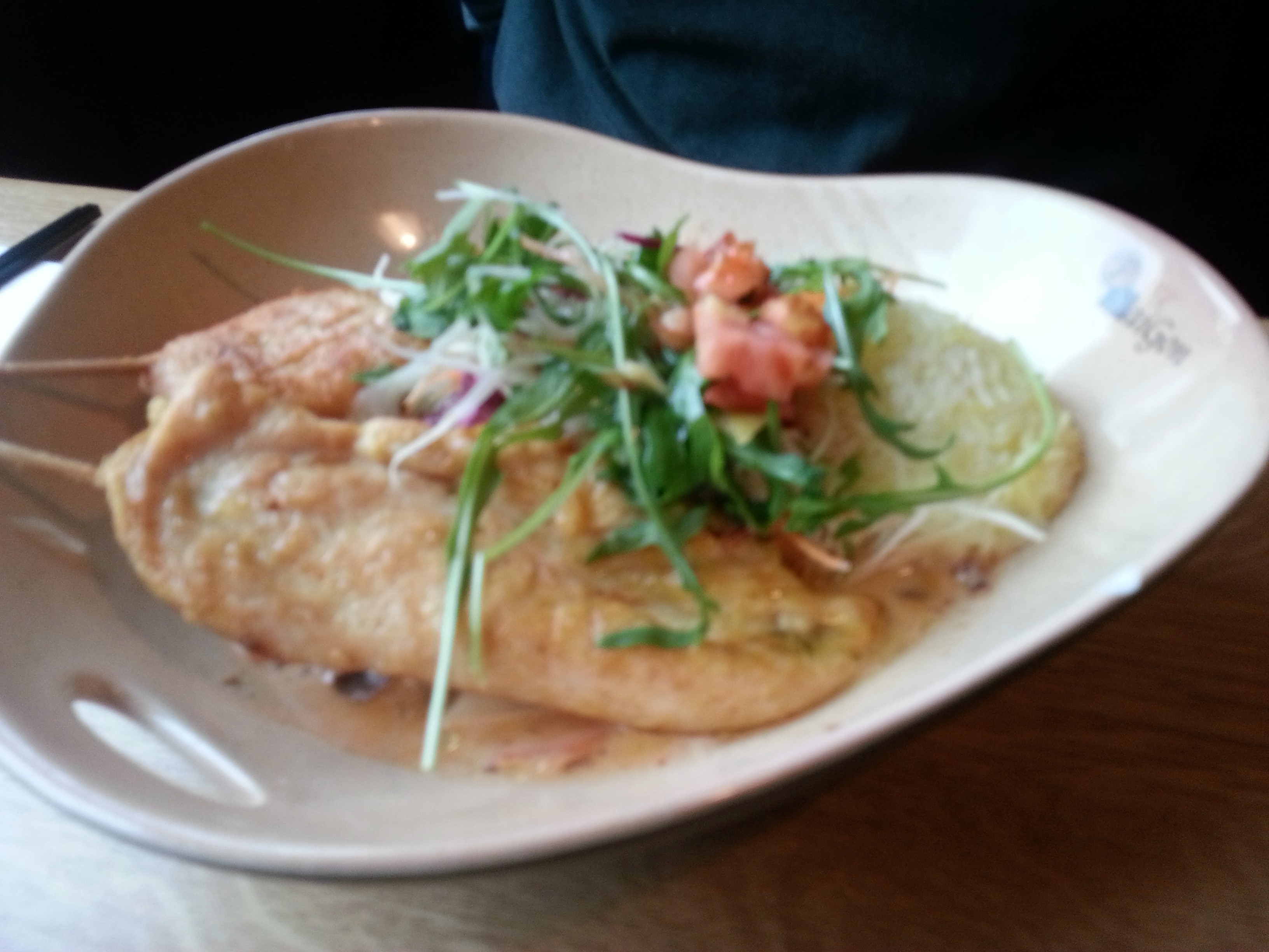 Ich wählte aus der Lunchkarte (ca. 4-5 Gerichte) einen Burger. Ja, wie kann man nur, mag einer fassungslos ausrufen, aber warum nicht? Der Burger besteht aus Seelachs mit Pankomehl, Dips und Salat. Liest sich gut, also probieren. Preis 5,80. W. wählte für 6, 50 Satayspieße mit Reis. Preislich gut.