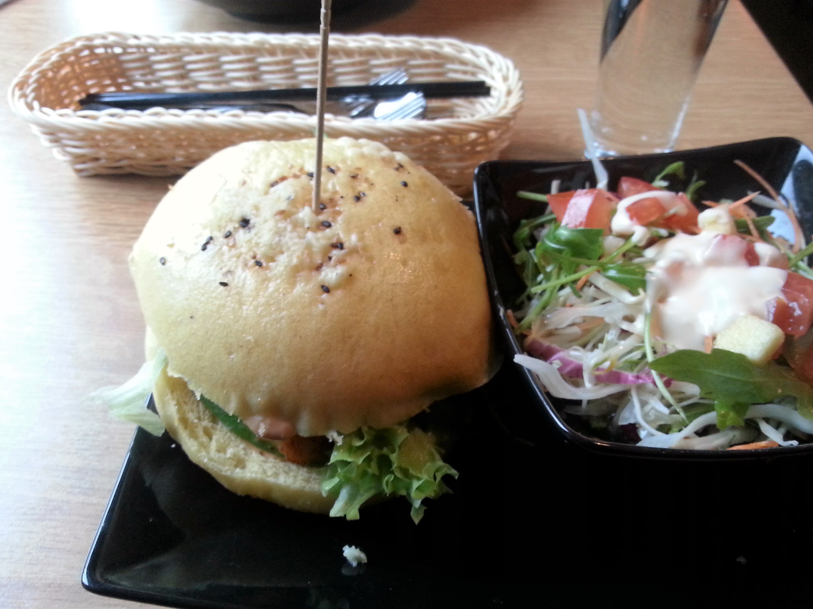Also, das Essen kam wirklich zügig und sah sehr gut aus. Ob es denn auch gut schmeckt? Mein erster Asia-Style Burger – wat bin ick doch jespannt…