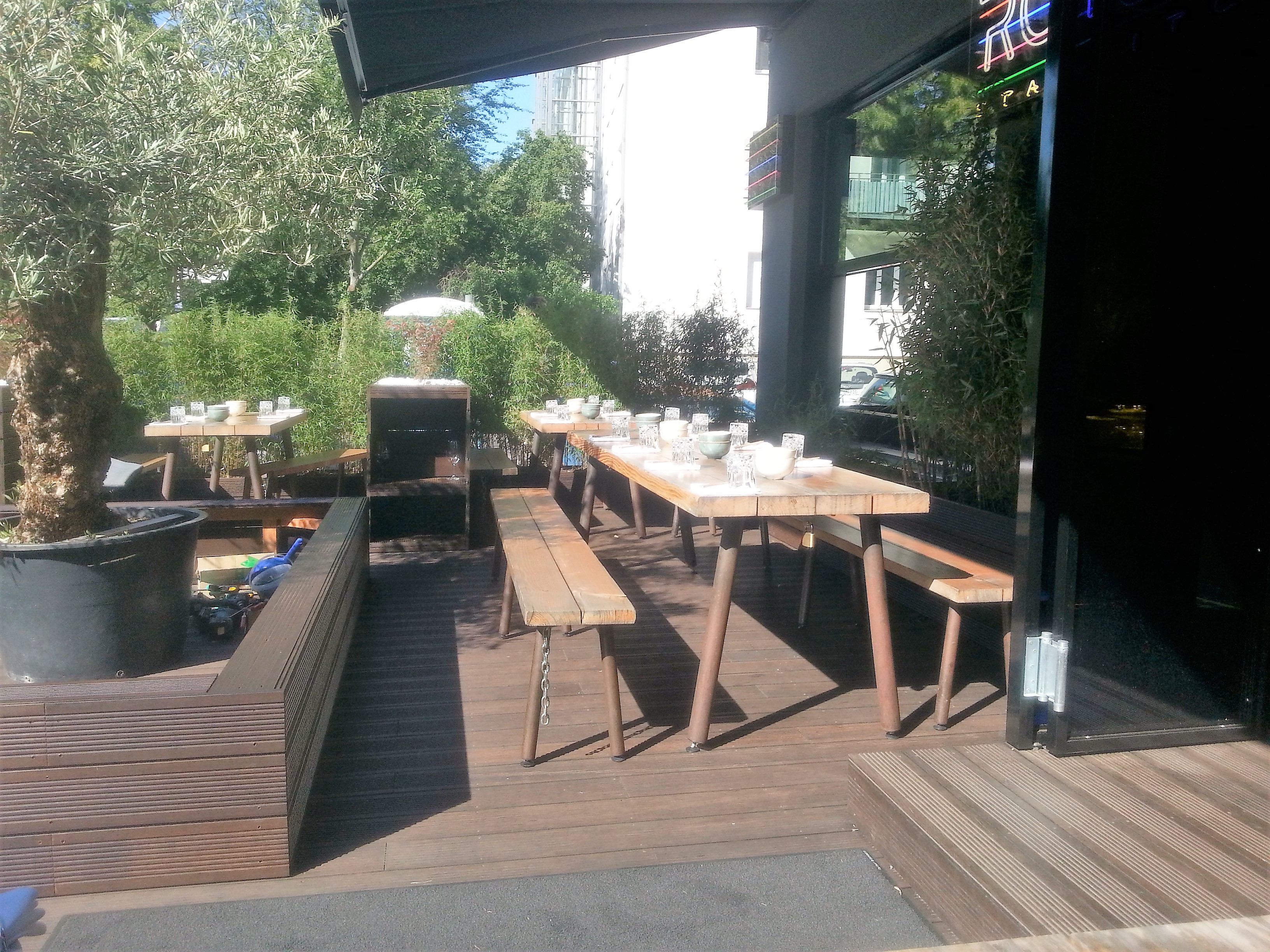 Aber nicht nur die Terrasse ist sehr schön, auch innen sehr, sehr coole Einrichtung. Am liebsten würde ich das nächste Mal an der Bar sitzen, und den Köchen aus Singapur & Malaysia beim kochen zugucken (und in einem unbeobachtetem Moment mit den Stäbchen in die Töpfe langen :-)) – Mach ich natürlich nicht.