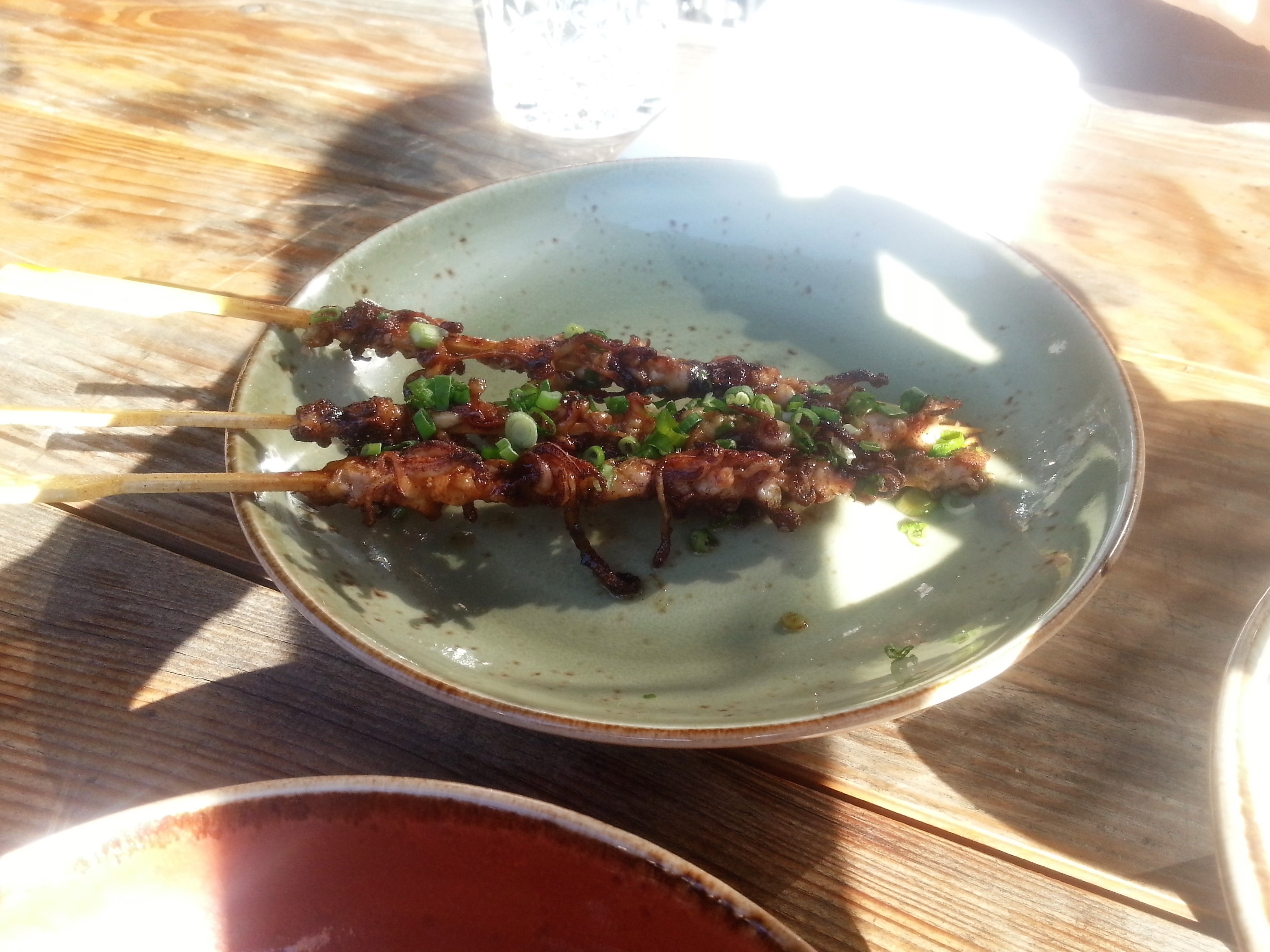 Optisch – ein Knaller. Jedes einzelne Gericht optisch perfekt auf sehr schönem Geschirr präsentiert. Geschmacklich ein absolutes Geschmackserlebnis! Die Baby Sepia Köpfe am Spieß unglaublich zart und würzig. Der Oktopussalat ebenso zart und mit dem Rhabarber und Radischen eine unbedingt zu wiederholende Geschmackserfahrung. Die Bittermelone war – wie sie ja schon aussagt – bitter. Nicht ganz so mein Fall, aber es passte dennoch zu den anderen Gerichten. Einen Morchelsalat hatte ich noch nie probiert – aber mit den Sardinien ebenso ein Knaller. Der Thunfisch mit dem leichte Wasabidressing – ein Gedicht. Irgendwann rutschte mir so etwas wie „geile Scheiße“ raus. Die Lambchops leicht scharf, perfekt gebraten. Ach was soll ich sagen. Es war einfach hervorragend. Die Auswahl die Nico für uns getroffen hat (man kann ruhig angeben wie viel man ausgeben möchte) erstklassig.